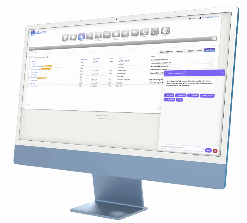 Embedded in your admin portal—built for system admins, super users, and support teams to manage phone systems, update settings, and get instant answers without tickets or